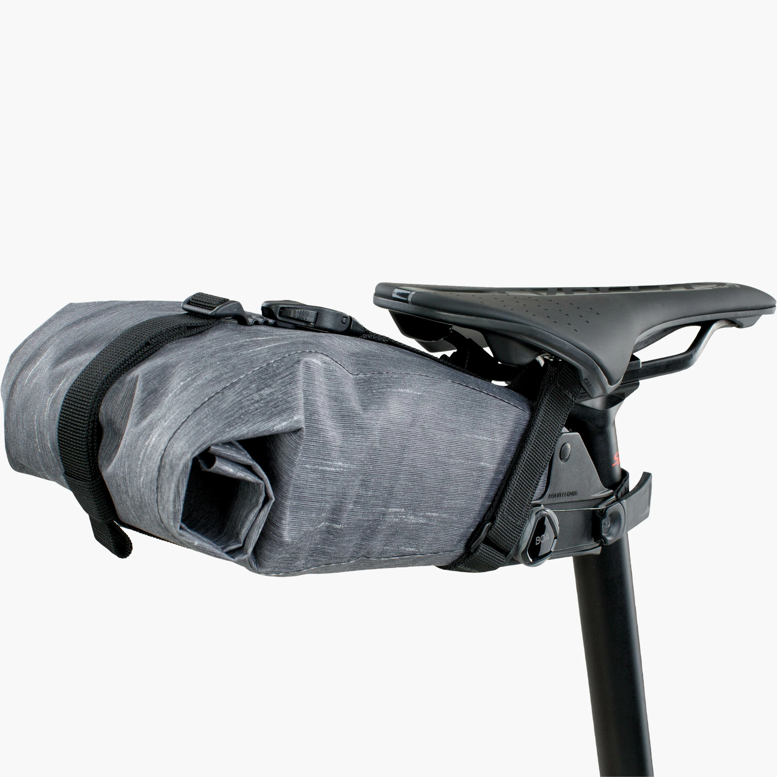 Evoc Seat Bag Boa satulalaukku Boa-kiristyksellä. Laukku on vedenpitävä sekä laukun tilavuutta voi säädellä helposti sulkumekanismin avulla. Laukun muotoilun vuoksi laukku sopii myös aero- ja hissitolppiin.