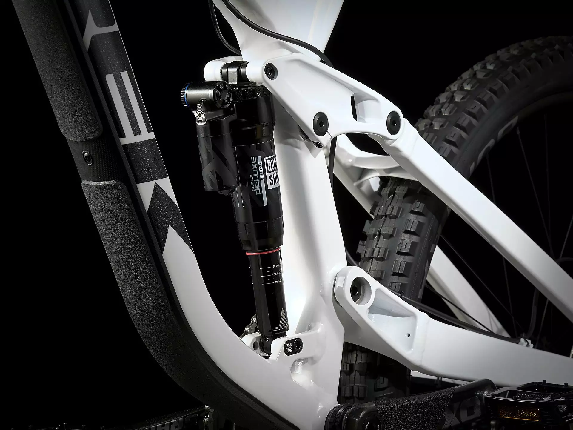 - Voit säätää jousituksen toimintaa takaiskunvaimentimen alakiinnikkeen vivusta (20 % ylellistä bikepark-ajoa varten, 25 % kisatehokkuutta varten)